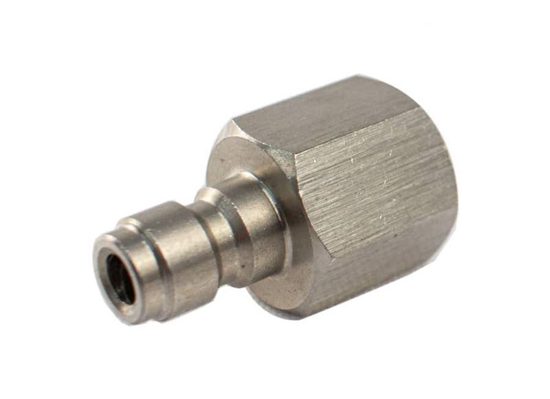 Engate rápido fêmea padrão Foster acoplável com facilidade e outra extremidade com rosca macho M10, projetado para instalações de recarga de ar comprimido (bombas manuais, compressores e cilindros SCUBA). Construção metálica usinada que oferece resistência mecânica e vedação confiável em linhas de alta pressão — recomendado para operações até 250 BAR.