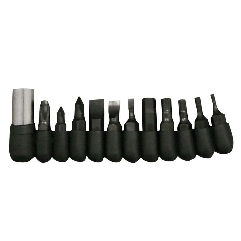 • Funções: Alicate com contador fio, chave philips, abridor de latas, chave de fenda, serra, lima, lâmina pequena, lâmina grande, chave de fenda pequena, abridor de garrafas, além de um conjunto com 11 chaves