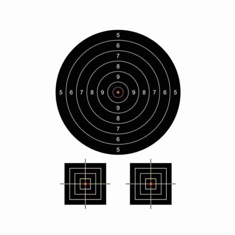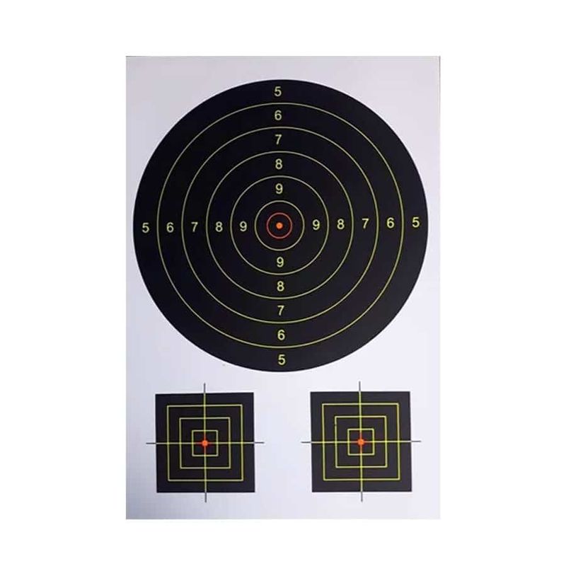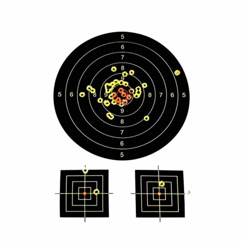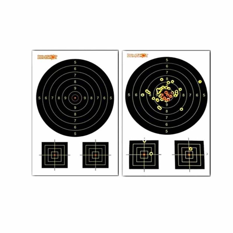 Cada folha vem com coladores de canto para facilitar o reparo! Esses alvos são ótimos para qualquer tipo de pistola de ar ou rifle de ar e em qualquer distância! Buracos de bala são revelados com anéis de marcação brilhantes para idetificação instantânea do tiro - não há necessidade de andar para até o alvo para detectar seu tiro.