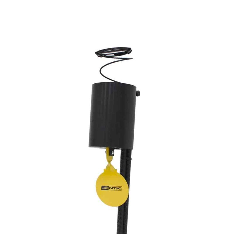 Prático e rapidamente montável, ele deve ser fixado ao piso para gerar a estabilidade necessária no disparo. Para fixar a lata, basta encaixar no topo e empurrar até travar a mola.