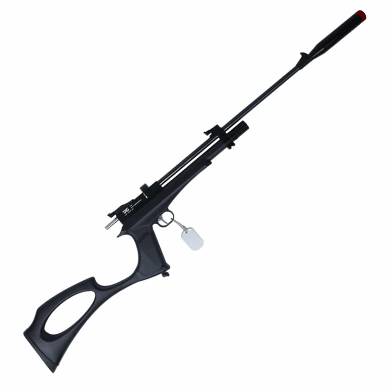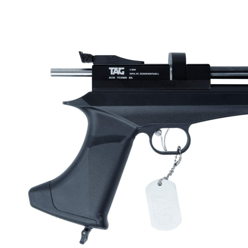 A Air Viper PCP XL 5.5mm da TAG é uma pistola híbrida. No modo pistola ela atinge 600fps - 180m/s, e no modo carabina, 700fps - 213m/s, com chumbinho padrão de 1g.