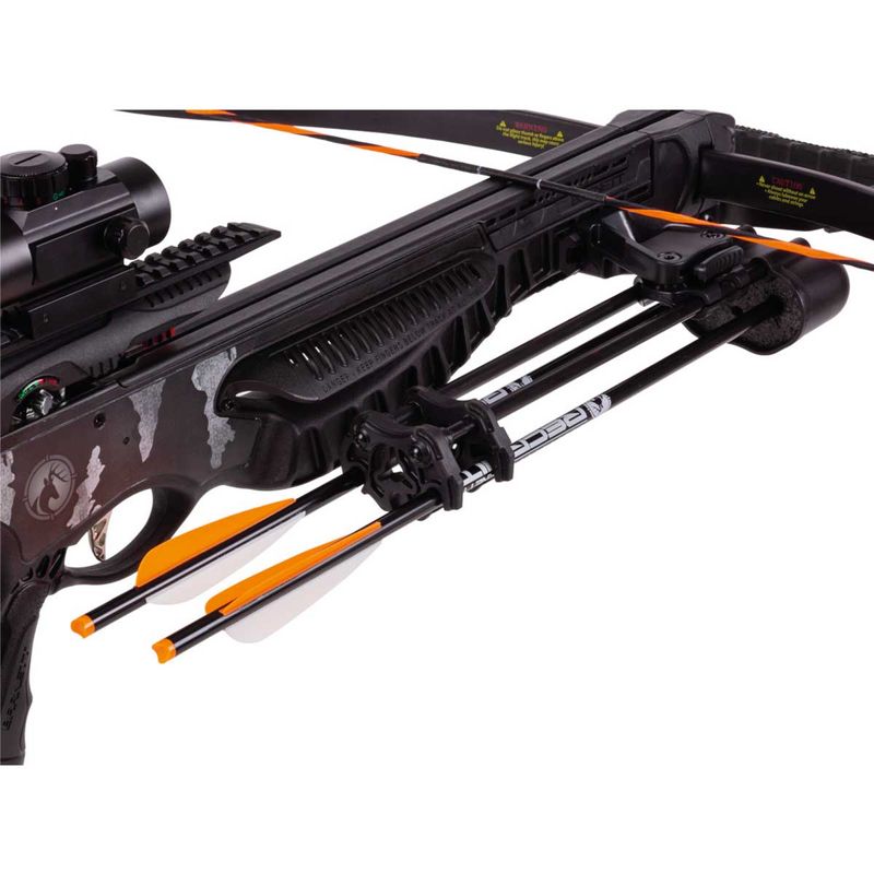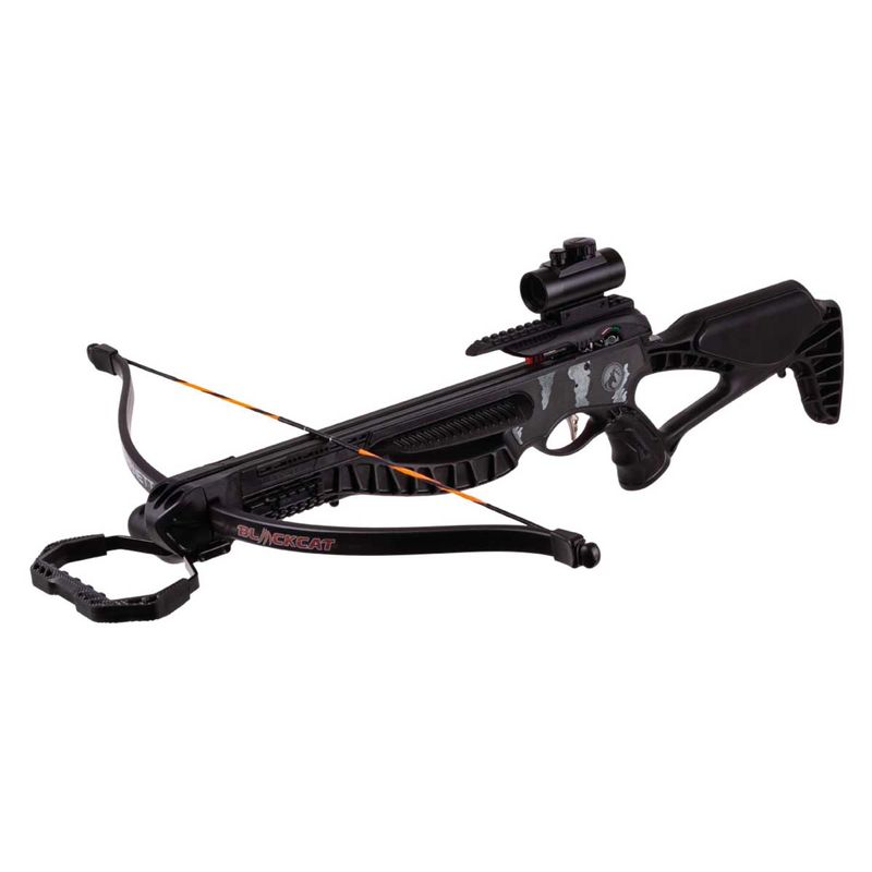 O Blackcat vem com uma mira de ponto vermelho e três trilhos picatinny permitem a personalização de acessórios. Fácil de montar com apenas alguns parafusos, o Blackcat está pronto para o intervalo com a aljava de montagem lateral incluída e duas setas de carbono.