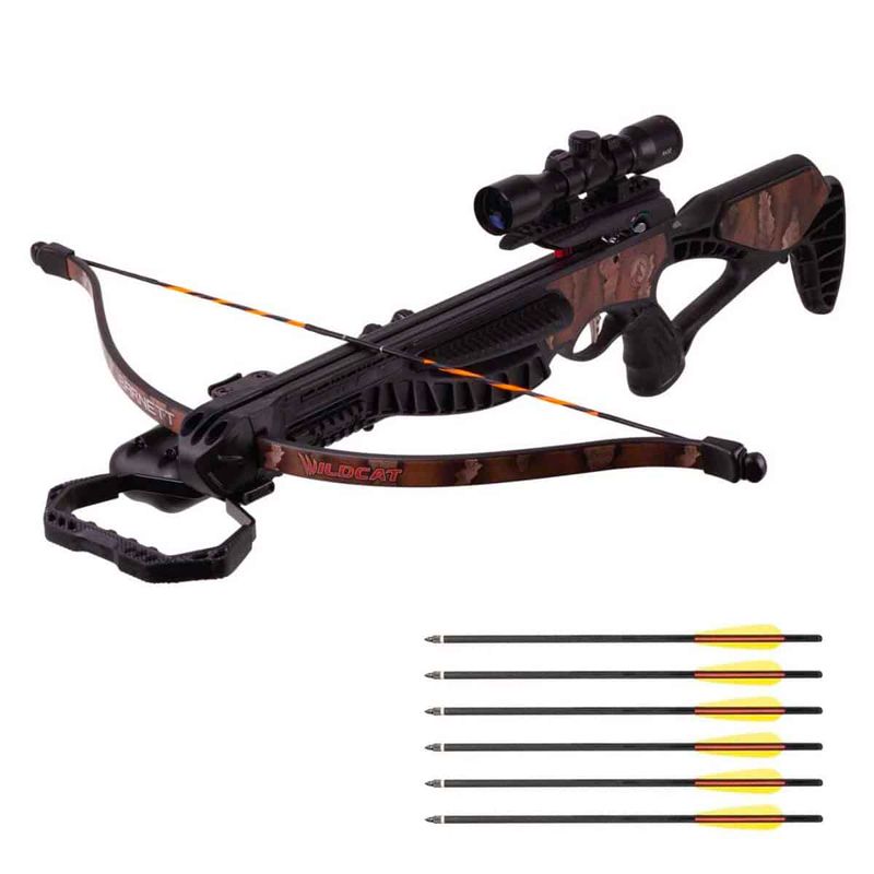 O Wildcat é finalizado com um envoltório de camuflagem Strike e vem com uma mira multi-retícula, flechas de alumínio e uma aljava de montagem lateral.