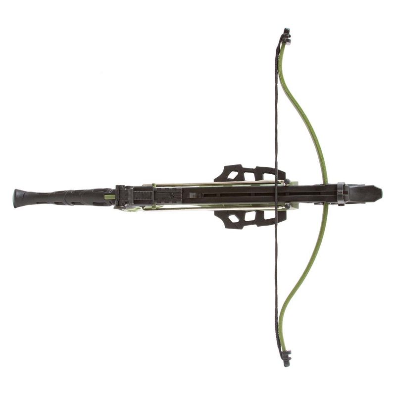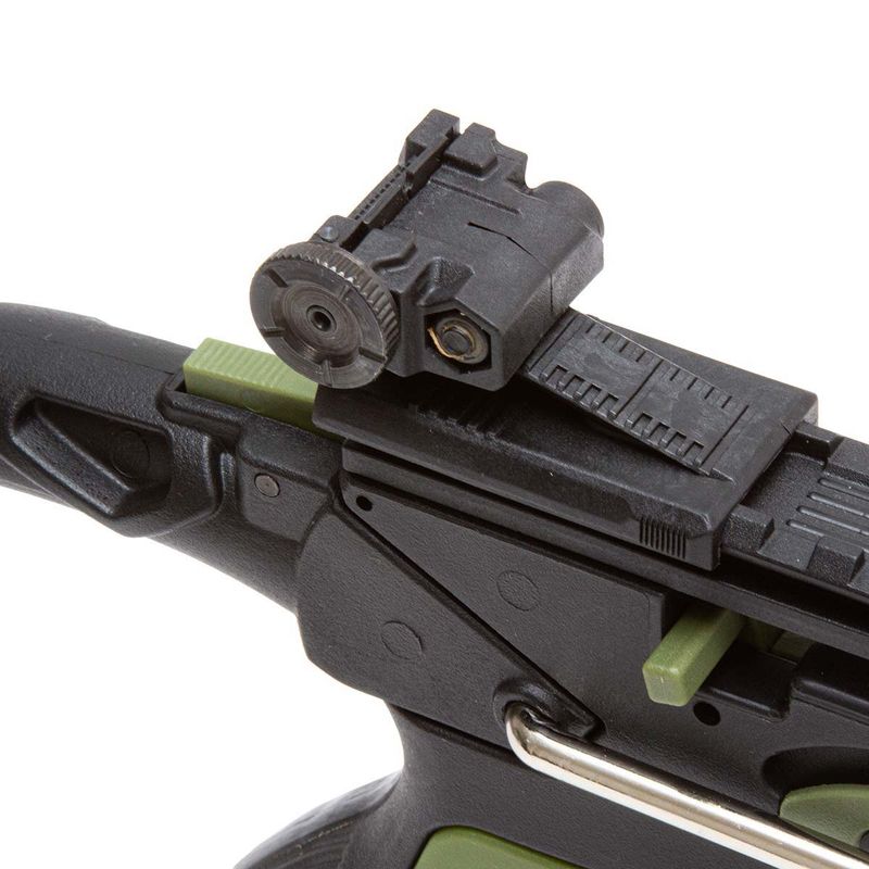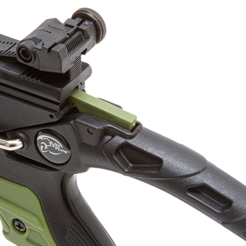 A MK-TCS1-G vem com um corpo durável em polímero verde com um design elegante de jacaré. A balestra também possui uma empunhadura ergonômica que oferece uma pegada confortável para o atirador, além de um sistema de mira com alça e massa de mira ajustáveis para melhorar a precisão do tiro.