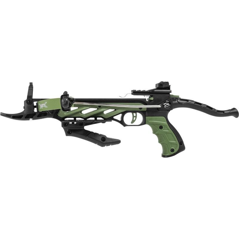 Com estrutura em polímero resistente e arco fabricado em fibra de vidro, a Alligator oferece durabilidade e leveza no manuseio. Seu sistema de segurança é duplo — manual e automático, garantindo proteção durante o uso. Conta ainda com trilho tipo Weaver/Picatinny de 22 mm, permitindo acoplagem de acessórios como lunetas e miras ópticas.