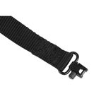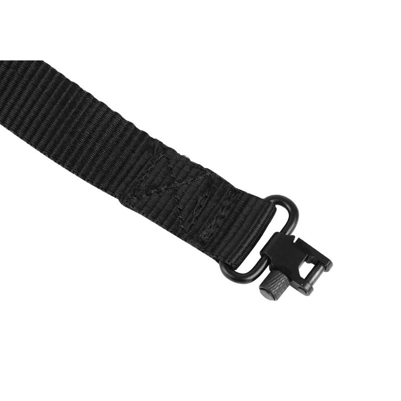 A bandoleira possui um acabamento com com trava giratória em aço que permite uma melhor mobilidade da arma mesmo com a bandoleira.