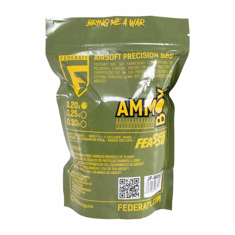 Se você procura desempenho, qualidade e custo, as BBs Federaty .20g com 3.000 esferas é sua melhor opção. Com a mesma qualidade das BBs mais famosas do mundo, como Krytac, Tokyo Marui, Classic Arms e G&G, as BBs Feasso não vai te desapontar.