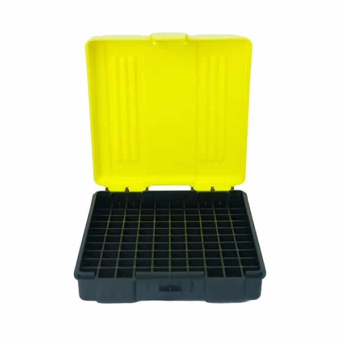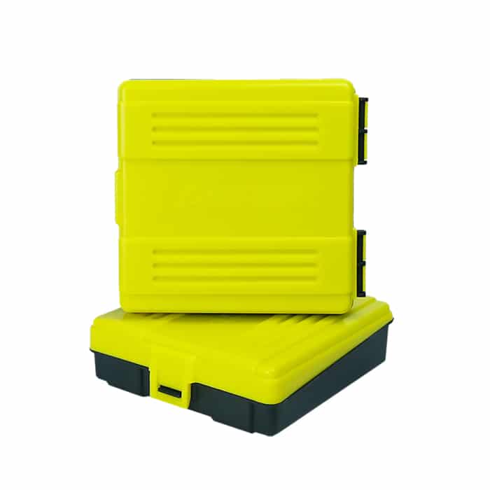 A Caixa de Munição Aurok 380/9 mm/38 super, é produzida em polímero de alta resistência, possuindo fechamento de encaixe, articulação tipo dobradiça e espaço interno delimitado para cada calibre.