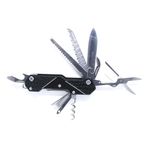 Possui descamador, abridor de latas, lâmina, saca rolha, lâmina serrilhada, punção, lixa, raspador, chave Philips, argola, chave de fenda, abridor de garrafa e tesoura