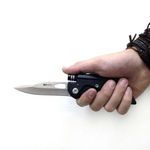 Com um fio excelente, sua lâmina de aço inox é do tipo reta e possui 9cm de comprimento, maior que a maioria dos canivetes do mercado. Seu acionamento é manual, sendo possível com apenas uma das mãos, e possui trava de segurança que permite também a utilização - e o fechamento do canivete - com apenas uma mão.