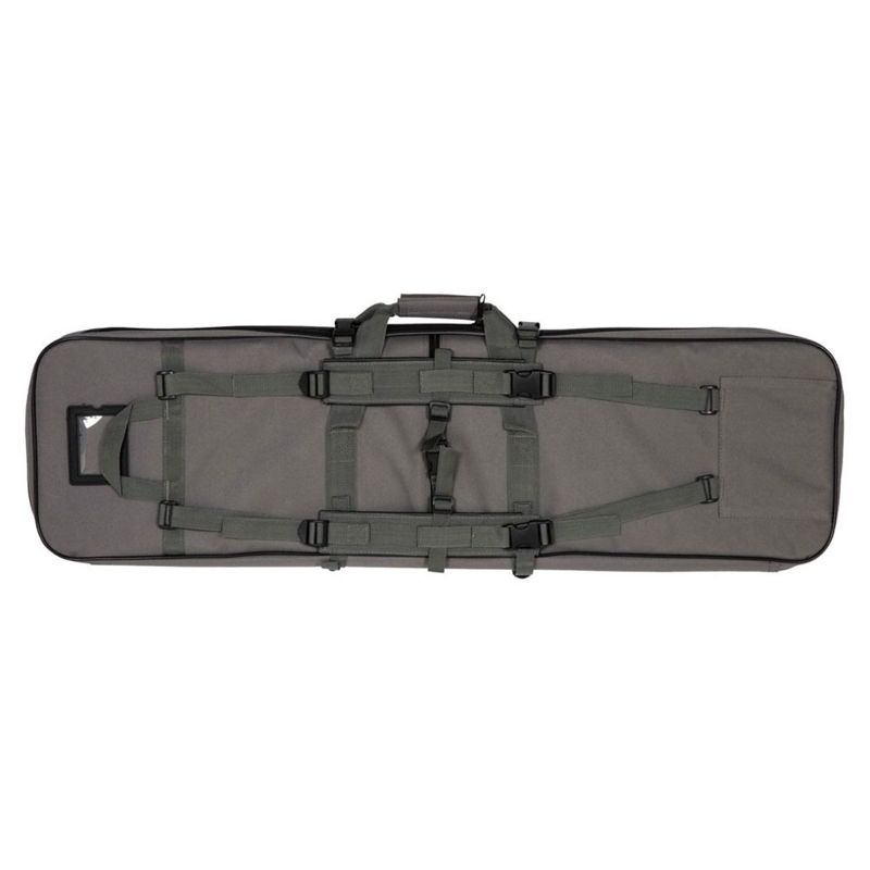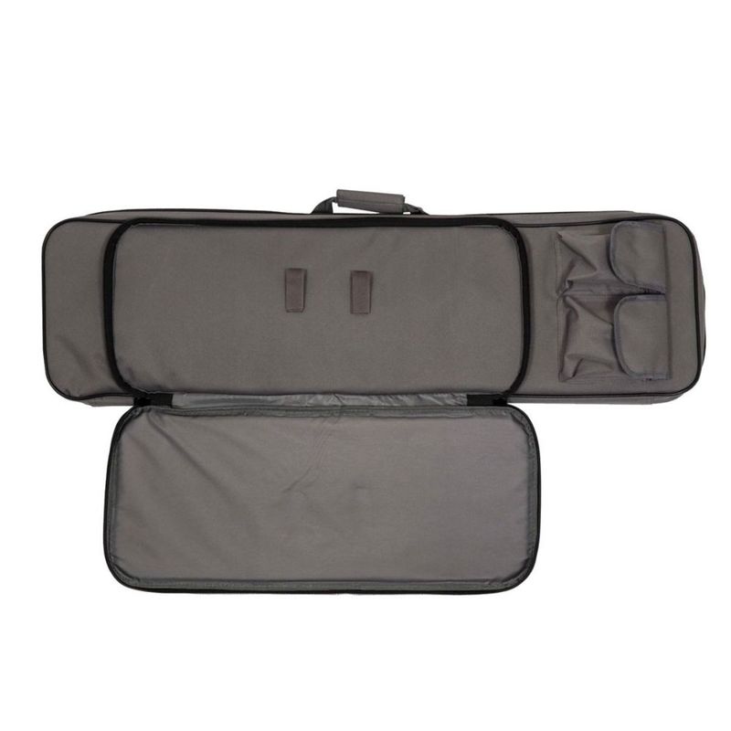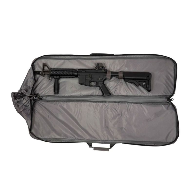 Ela comporta uma réplica de carabina com comprimento máximo de 950 mm e, ao abrir a manga extensível com zíper, o comprimento total aumenta para 1150 mm, permitindo acomodar modelos maiores com total segurança.