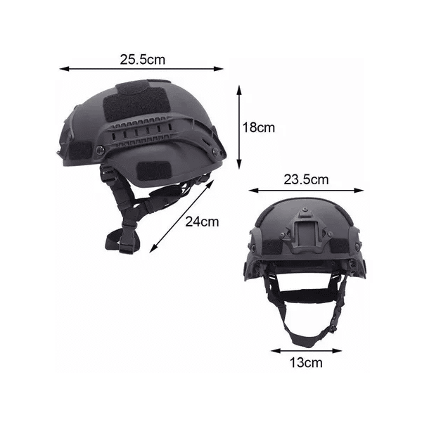 Em resumo, um capacete militar tático na cor preto é um equipamento de proteção individual projetado para oferecer proteção contra impactos e ferimentos na cabeça durante operações táticas e missões críticas. Eles são fabricados com materiais resistentes, apresentam uma estrutura sólida e resistente, e podem ser equipados com uma variedade de acessórios para atender às necessidades específicas do usuário.