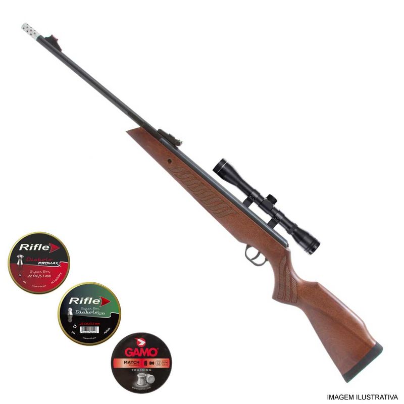 + 125 Chumbinhos Rifle STR 5,5mm .22 + 250 Chumbinhos Rifle ProMax 5,5mm .22 + 125 Chumbinhos Gamo Match 5,5mm .22 + Luneta 4x32 Polly