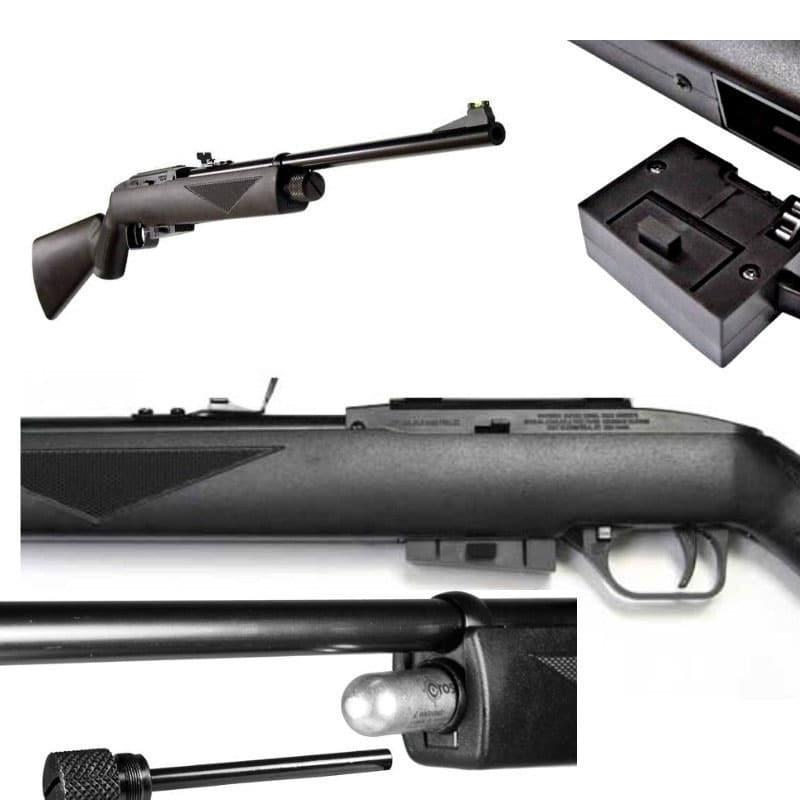 Leve, prática e silenciosa, a 1077 é construída com coronha sintética durável e cano de aço com alma raiada, que garante precisão nos disparos. A carabina possui mira frontal com fibra óptica e mira traseira ajustável para vento e elevação. Seu trilho de 11mm permite a instalação de lunetas ou red dots.