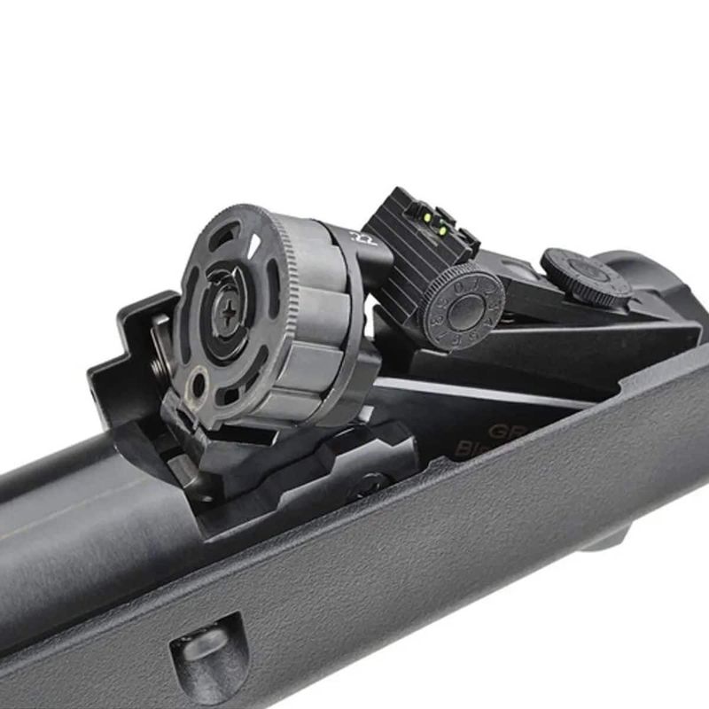 A capacidade da Black Hawk é de 12 tiros com magazine rotativo superior