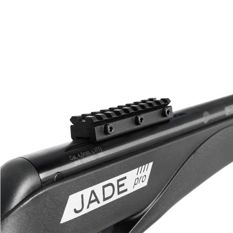 A Carabina Jade Pro Nitro da CBC atira chumbinho calibre 4.5mm (.177) no modo um a um, com cano de "quebrar"