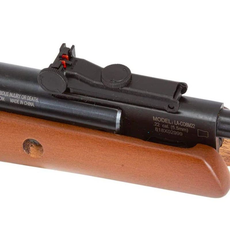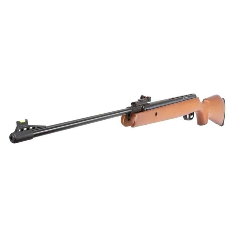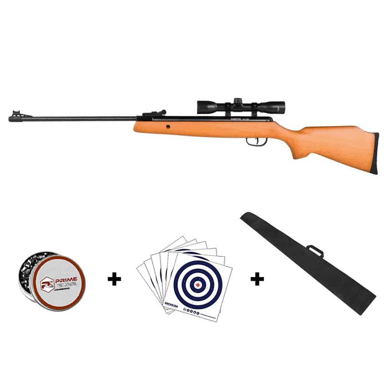 A carabina vem equipada com miras de fibra óptica, sendo a massa fixa e a alça ajustável. Além disso, o trilho de 11mm permite a instalação de acessórios como a luneta 4x32 que já acompanha o produto, oferecendo ainda mais precisão nos disparos.