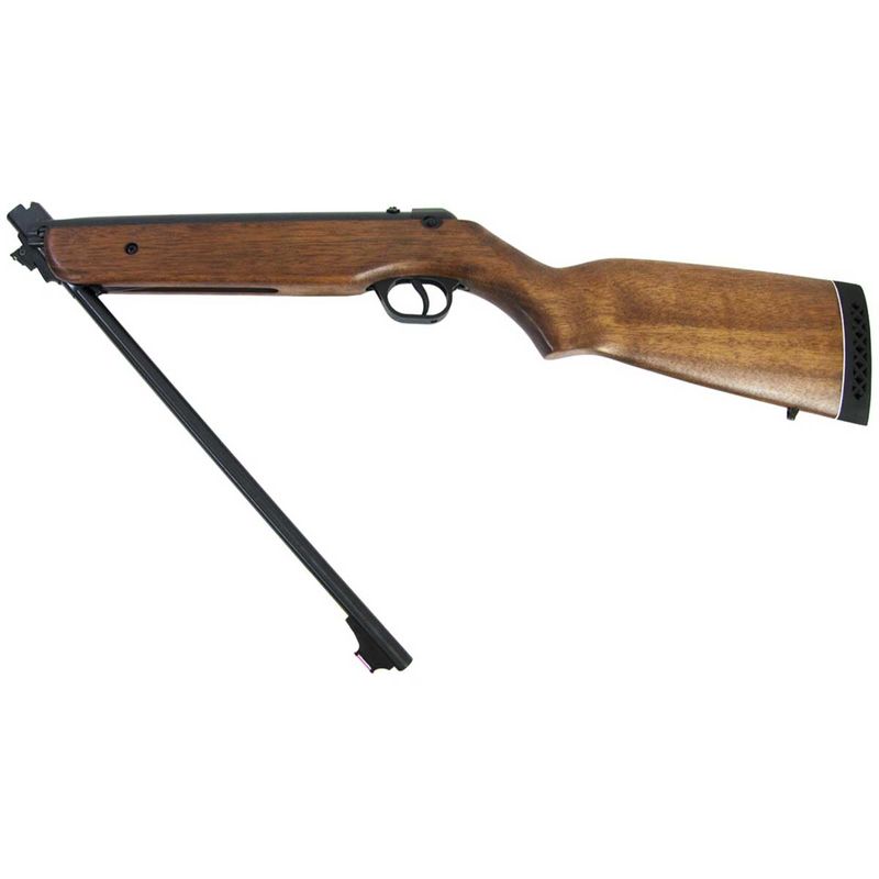 Funcionando através do basculamento do cano, a Nova Dione em Madeira possui sistema tiro a tiro de 1 chumbinho