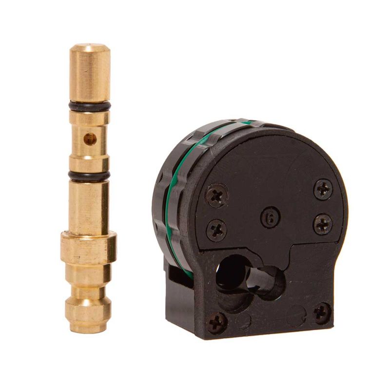 O manômetro está localizado abaixo do cano e permite monitorar a pressão interna do cilindro (até 250 BAR), o que, junto à válvula reguladora, oferece maior controle sobre os disparos.