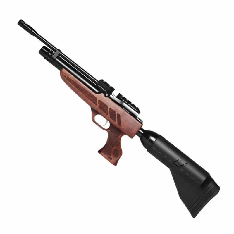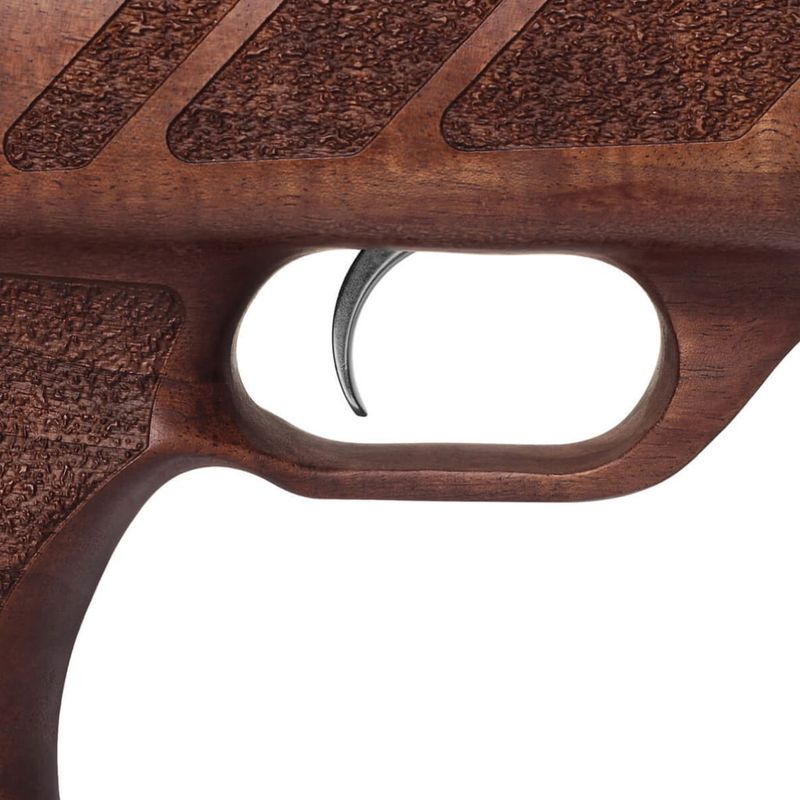 Com projeto diferenciado, possui uma garrafa de ar traseira e cilindro frontal que juntos oferecem até 200 disparos por recarga. Seu design robusto e acabamento premium em madeira sólida com entalhes personalizados impressionam tanto visualmente quanto na empunhadura ergonômica.