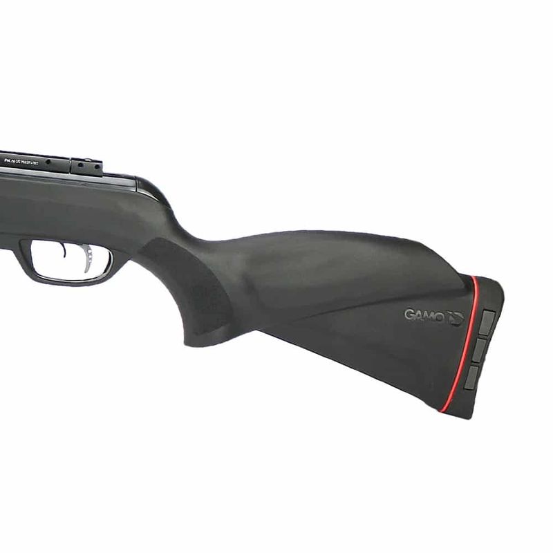 O modelo traz a renomada coronha sintética da Gamo, ambidestra e equipada com soleira SWA (Shock Wave Absorber), capaz de absorver até 70% do recuo. Já o gatilho com tecnologia CAT oferece ajuste independente dos dois estágios, permitindo uma experiência personalizada ao atirador.