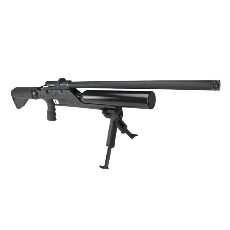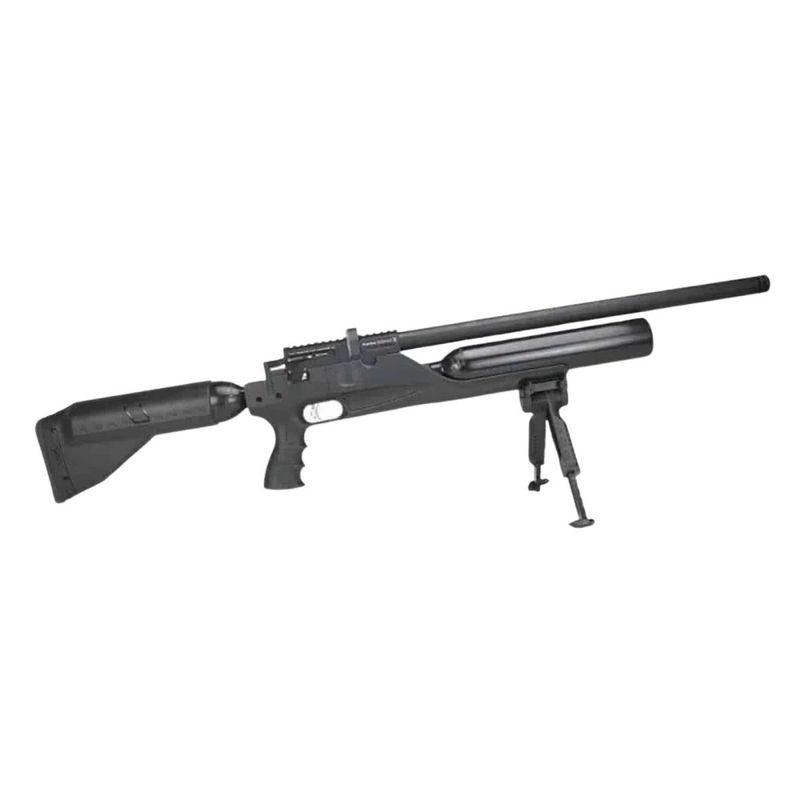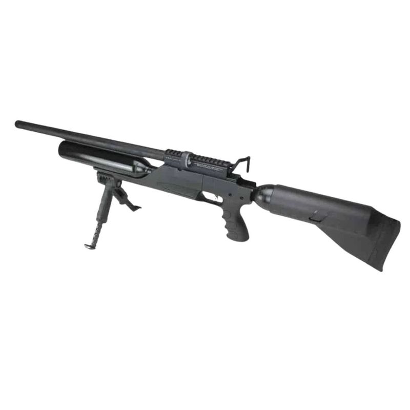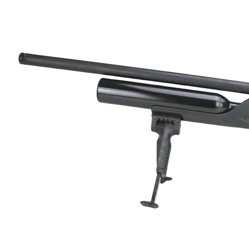 Esta versão conta com dois cilindros de ar integrados (frontal + traseiro) somando 925 cc de capacidade, proporcionando autonomia excepcional — mais de 100 disparos por enchimento dependendo da regulagem. O sistema PCP combinado ao engatilhamento por alavanca lateral (Side Lever) garante operação suave, rápida e confiável.