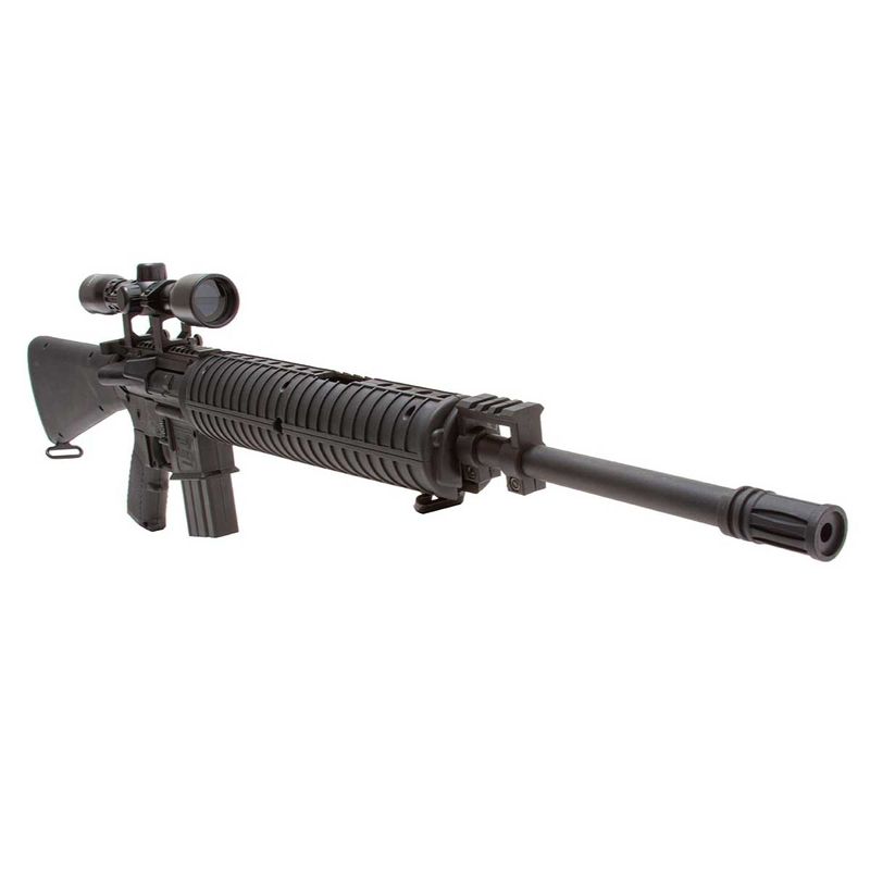 Carabina de ar comprimido da Crosman no calibre 4,5 mm. Óptica única combinada com o novo sistema de pistão Nitro da Crosman. Um rifle de ar comprimido sem mola, mas com sistema de pistão. Desenho AR15 - M16. Nitro Piston System - fixação sem mola, mas com sistema de pistão.