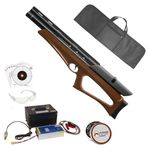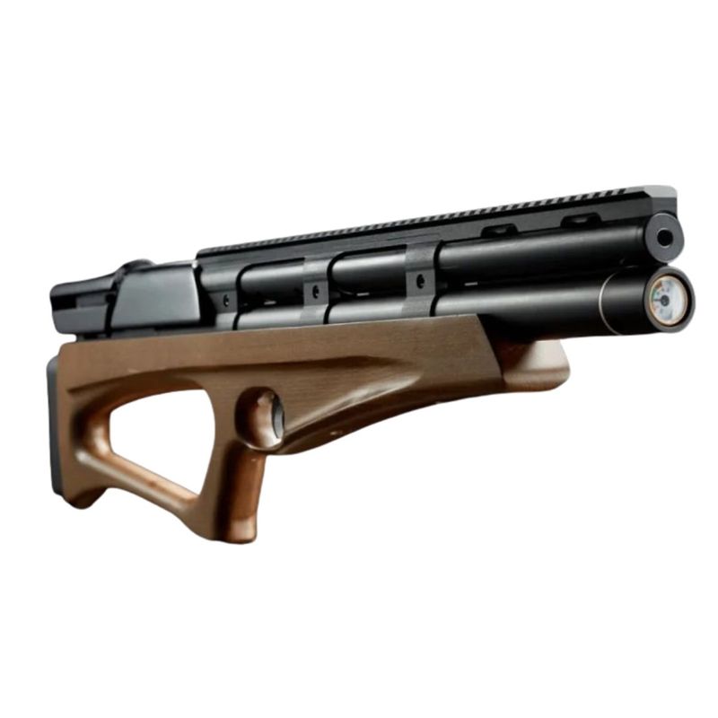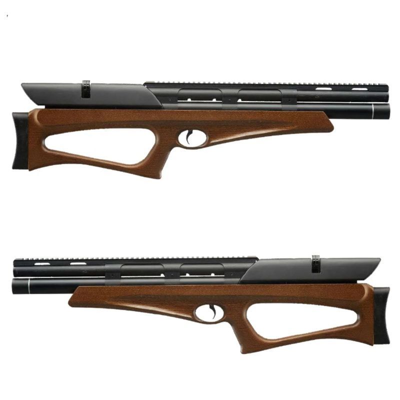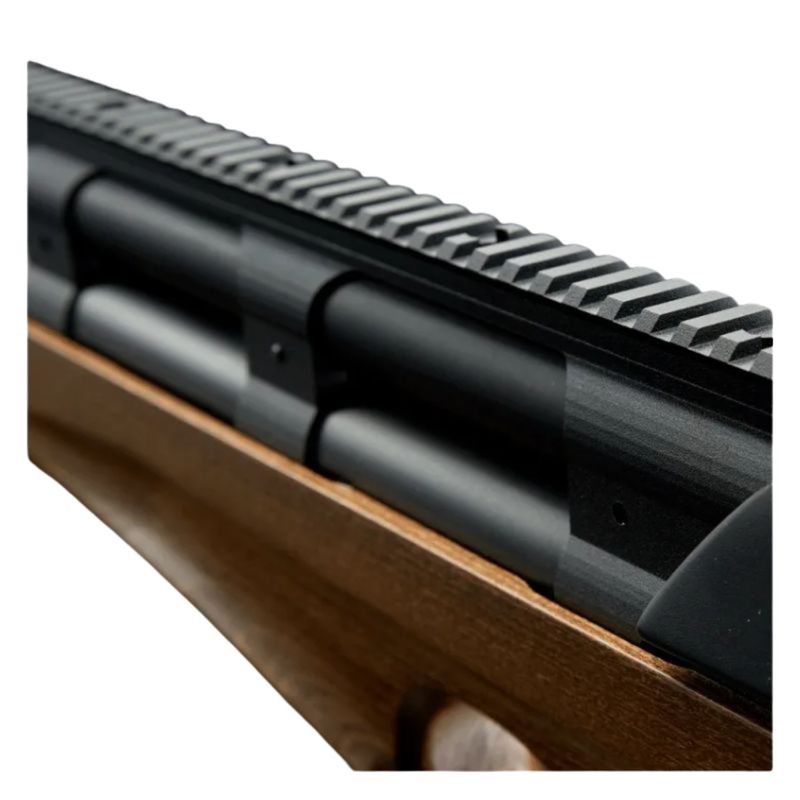A construção combina materiais resistentes nas áreas críticas com acabamento em madeira na coronha, resultando em um equipamento que une estética, sensação tátil e robustez funcional — ideal para quem valoriza tanto o aspecto técnico quanto o visual da carabina.