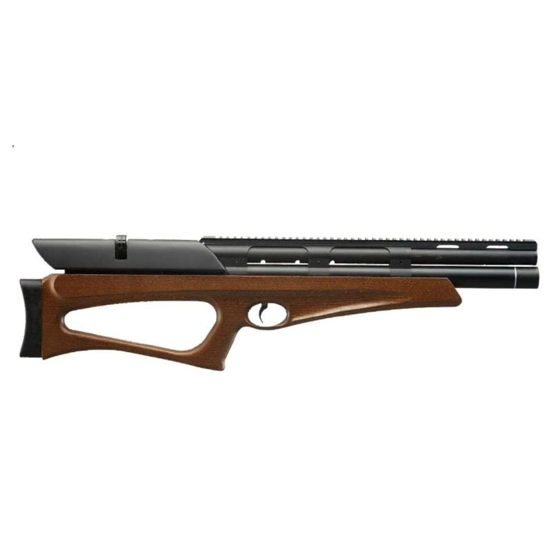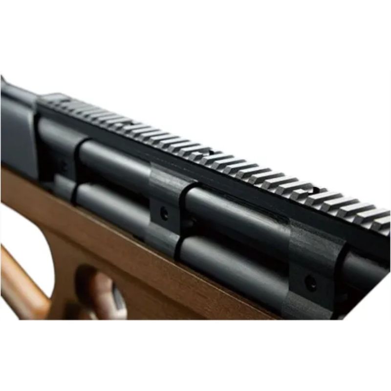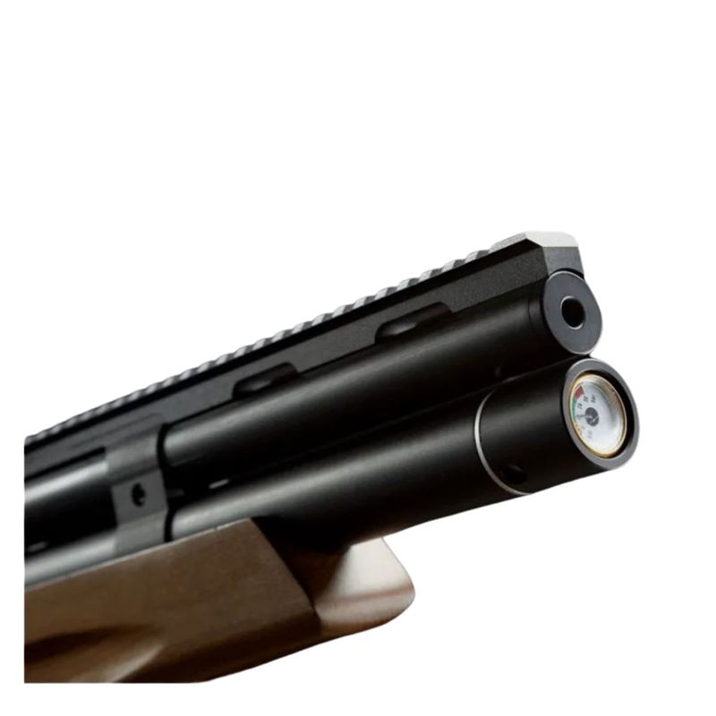 A construção combina materiais resistentes nas áreas críticas com acabamento em madeira na coronha, resultando em um equipamento que une estética, sensação tátil e robustez funcional — ideal para quem valoriza tanto o aspecto técnico quanto o visual da carabina.