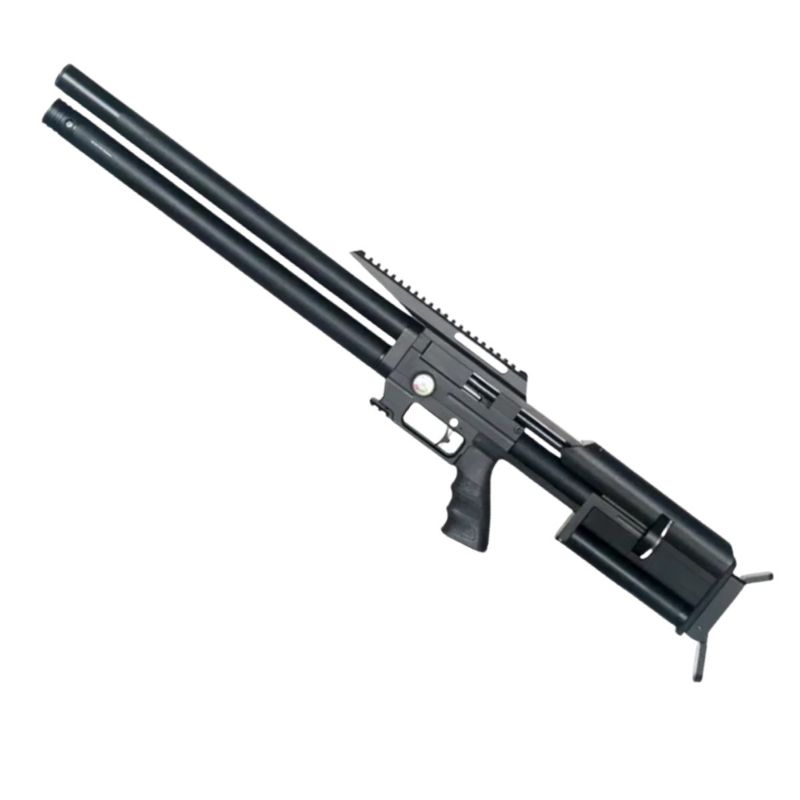Com capacidade de atingir até 1200 FPS (≈ 365 m/s) e energia de projeto até 110 J, a Max 1 entrega velocidade, estabilidade e impacto superiores no calibre .22, sem abrir mão de ergonomia e controle: cilindro de 550 cc pressurizado a 300 BAR, dois power plenums integrados para fluxo de ar otimizado, regulador de pressão ajustável externamente, cano microraiado de 700 mm com supressor integrado e magazine rotativo para 20 disparos.