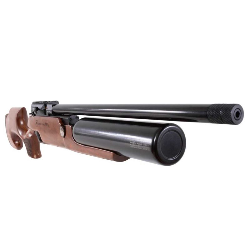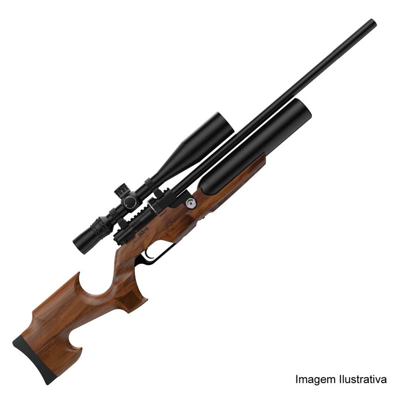 Uma obra de arte! A Carabina PCP MX6 6,35mm .25 Matte Black Wood da Aselkon conta com válvula reguladora de pressão, gatilho ajustável e um carregador com capacidade para 10 chumbinho!