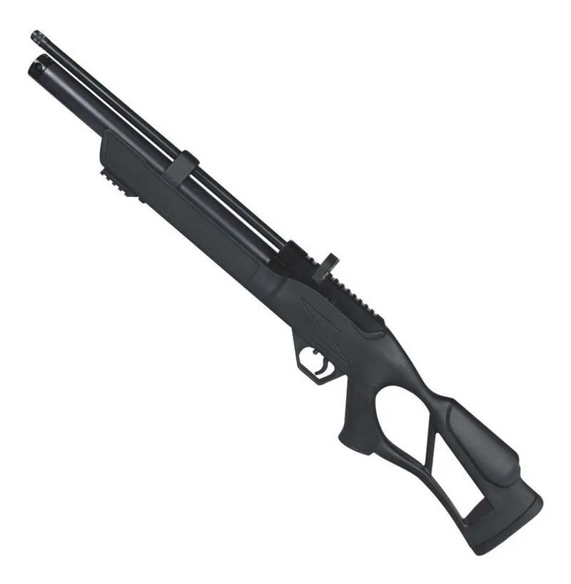 A Carabina PCP Chumbinho .25 6.35mm Hatsan Flash Syntetic dispara no modo Repetição (Ferrolho) com velocidade de 870fps - 265m/s e energia de 54 Joules Ver mais