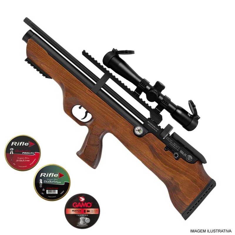 + 125 Chumbinhos Rifle STR 5,5mm .22 + 250 Chumbinhos Rifle ProMax 5,5mm .22 + 125 Chumbinhos Gamo Match 5,5mm .22 + Luneta 4x32