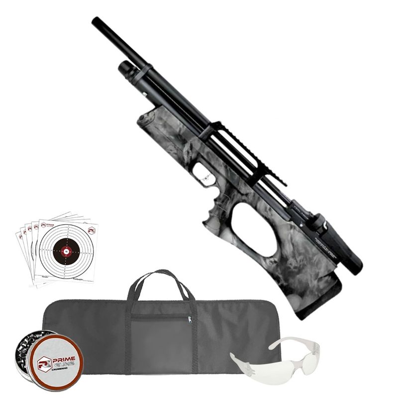 Design Bullpup Camuflado: A coronha do tipo Bullpup permite que a carabina tenha um comprimento total mais curto (73 cm), mantendo o mesmo comprimento de cano (53,5 cm), resultando em uma arma mais compacta, equilibrada e fácil de manusear. O acabamento Skull, com caveiras em toda a extensão da coronha, confere um visual marcante e exclusivo.