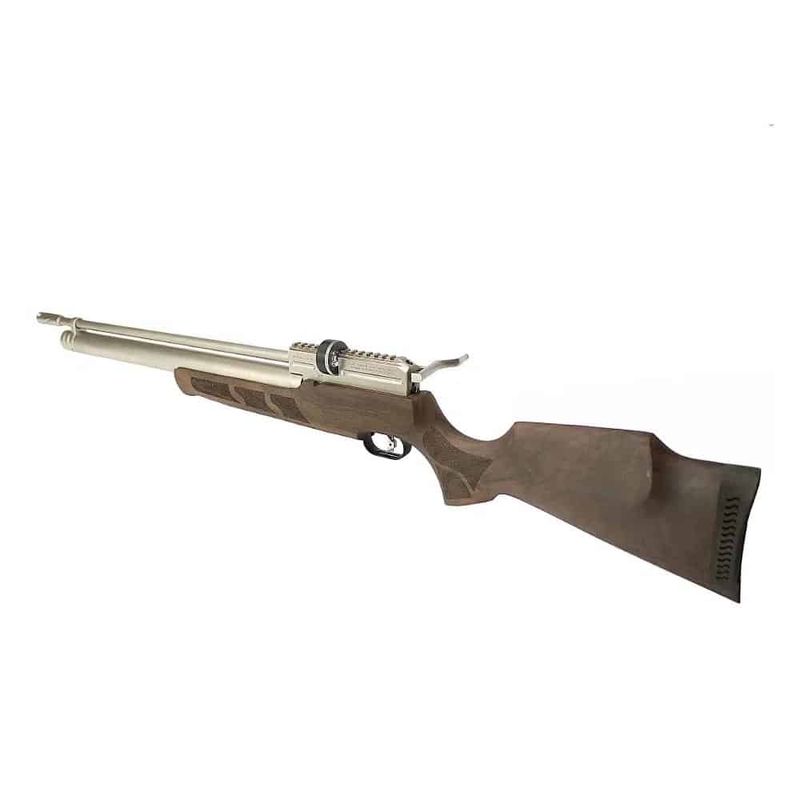 • Características: Alma Raiada, Engatilhamento Side Lever, Gatilho Ajustável, Coronha em Madeira, Manômetro Integrado, Trilho para acessórios