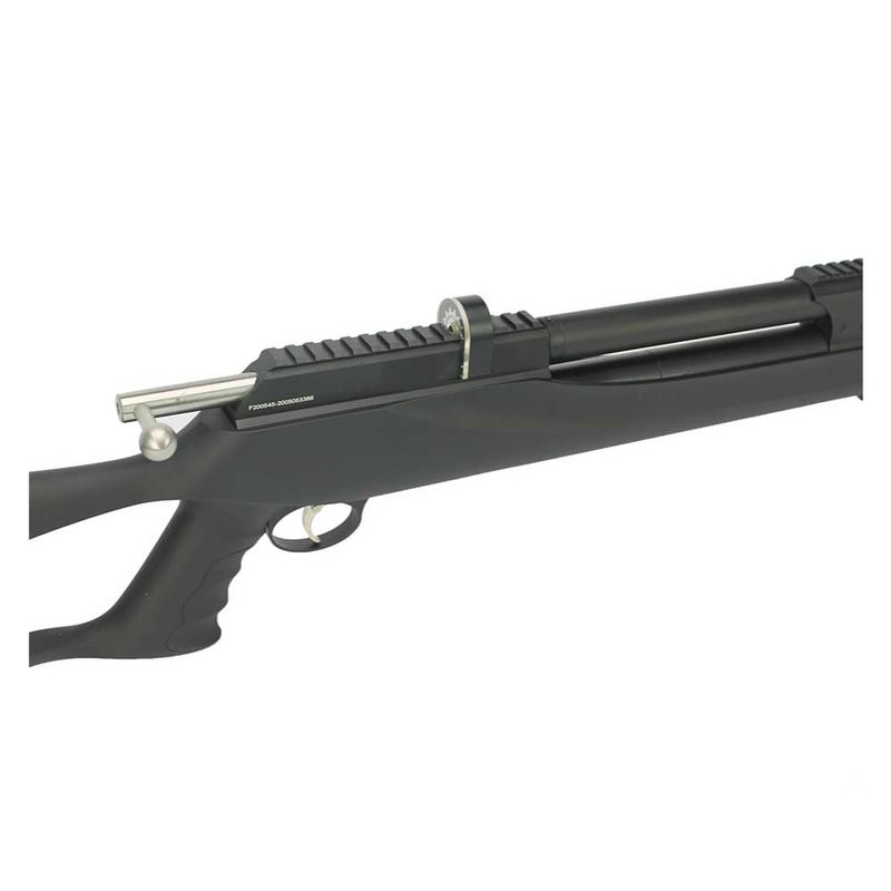 A carabina M25 PCP 7.62 possui um engatilhamento por um robusto e confortável ferrolho no estilo Side Bolt. Seu ferrolho possui encaixe traseiro e inox.