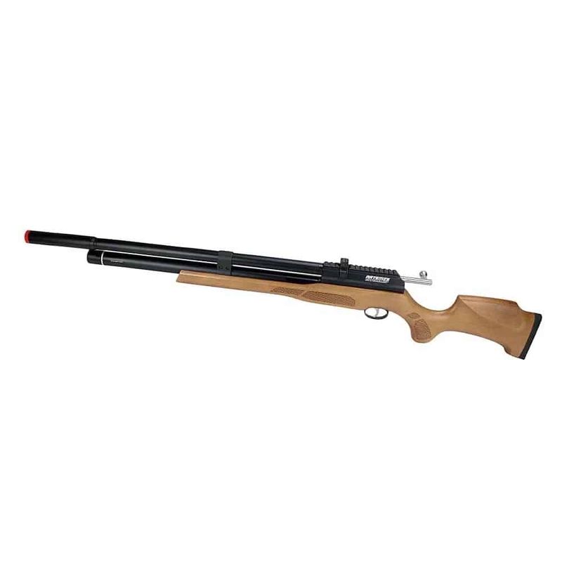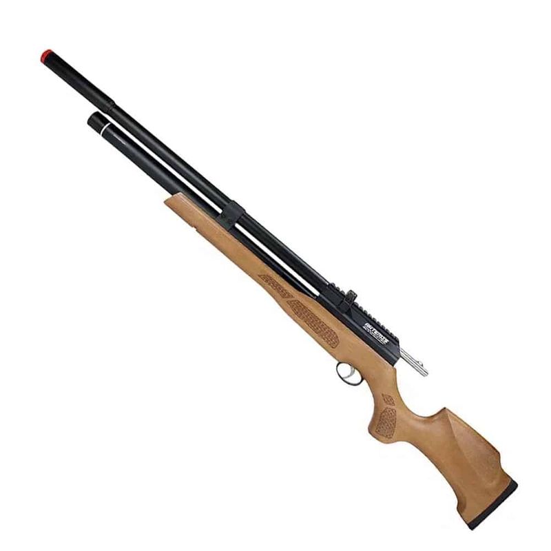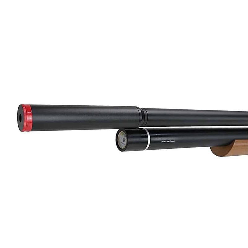 A coronha de madeira European Beech confere elegância e ergonomia, garantindo conforto durante o uso prolongado. O supressor integrado e o sistema Airstriper asseguram disparos mais silenciosos e suaves, sem comprometer a eficiência.