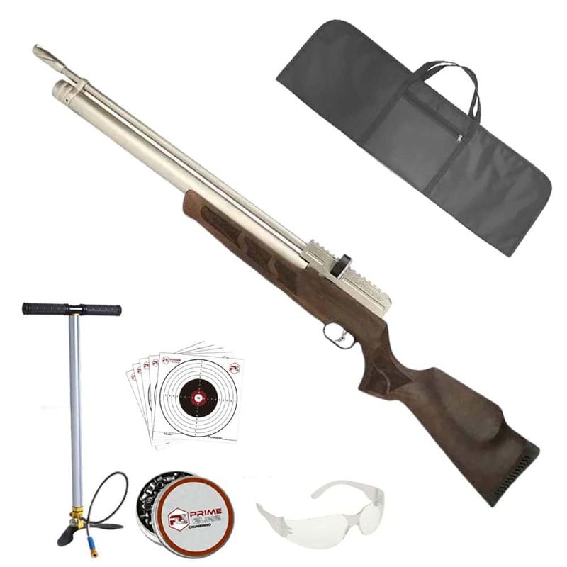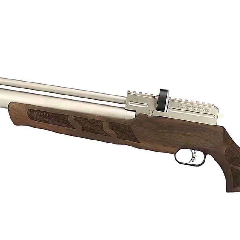 • Características: Alma Raiada, Engatilhamento Side Lever, Gatilho Ajustável, Coronha em Madeira, Manômetro Integrado, Trilho para acessórios