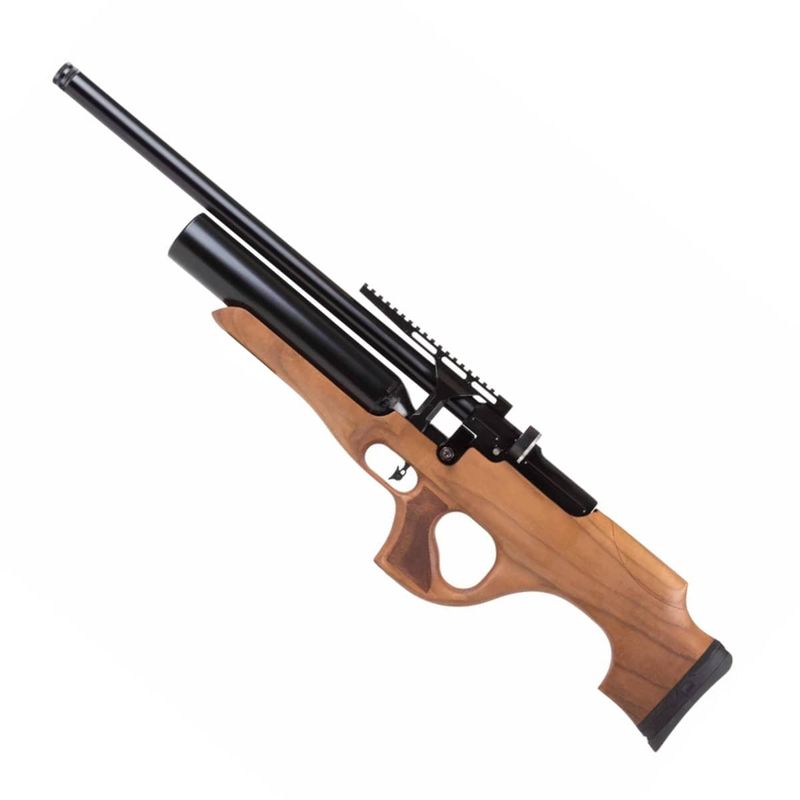 Possui cano silenciado, rail superior de 22mm tipo Picatinny, e construção em madeira e metal anodizado preto fosco. Uma carabina de alto desempenho, visual imponente e tecnologia de ponta.
