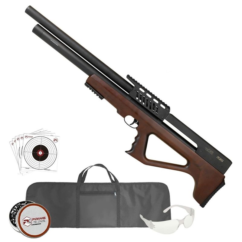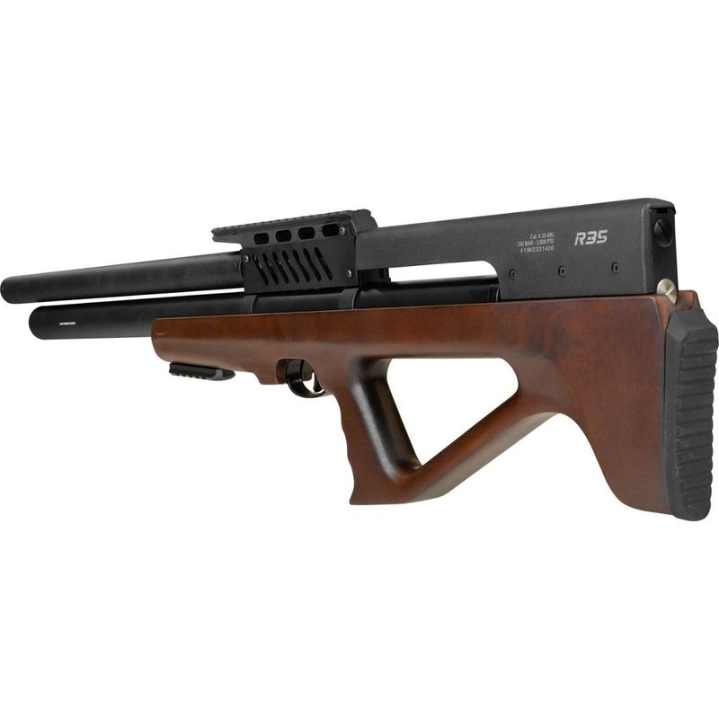 Construída em metal com coronha em madeira de acabamento liso e empunhadura ambidestra, a R35 alia robustez estrutural a um visual refinado. O funcionamento em PCP (ar pré-comprimido) conta com reservatório de 300 cc, operando entre 75 e 250 bar, além de válvula reguladora de pressão, garantindo disparos mais constantes e previsíveis.