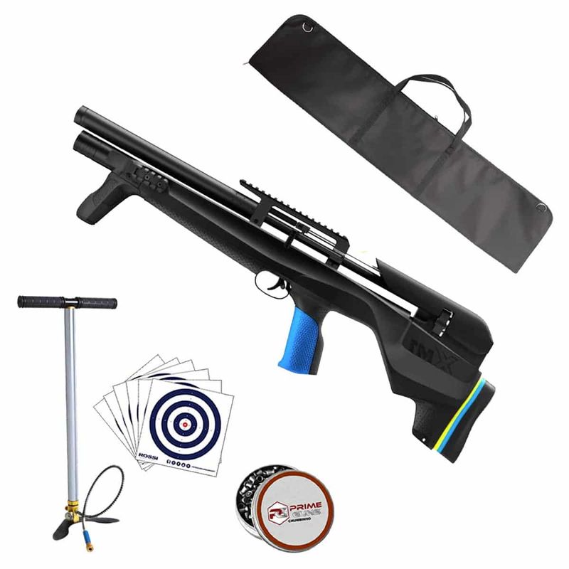 • Acessórios inclusos: 2 magazines, front grip, adaptador monotiro, bico de enchimento, trilhos extras, apoios de bochecha e grips intercambiáveis