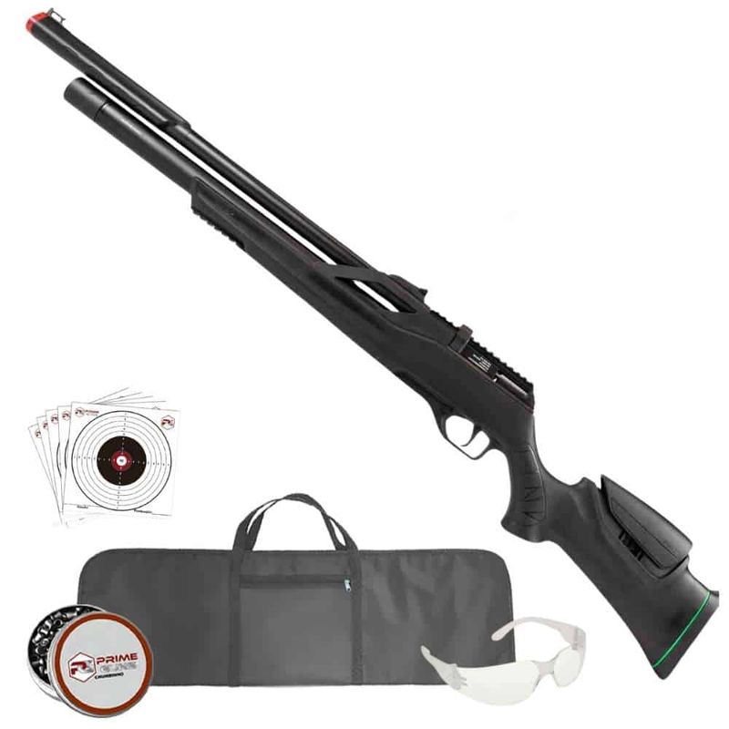 A coronha possui acabamento tático, com empunhadura ambidestra e encosto Montecarlo ajustável, garantindo conforto e estabilidade durante o uso. O modelo conta ainda com um trilho Picatinny de 22mm, permitindo a instalação de acessórios como lunetas e red dots para aprimorar ainda mais a experiência de tiro.
