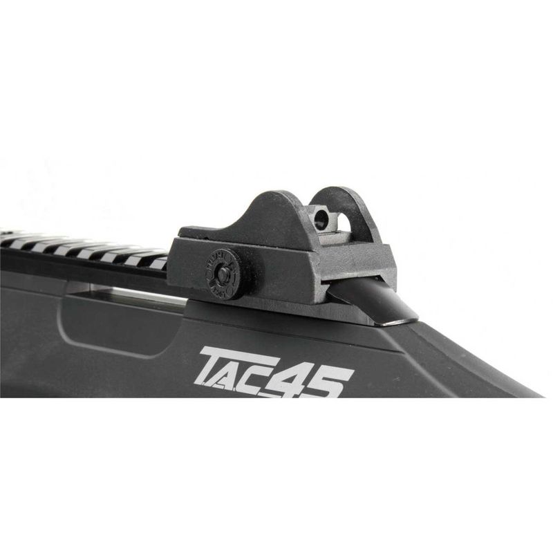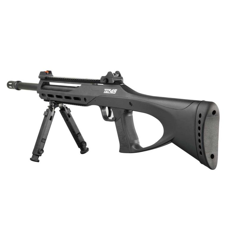 Além disso, a carabina de CO2 TAC 4.5 está equipada com uma mira de fibra óptica de dois tons, que pode ser removida ou ajustada se necessário. O TAC 4.5 é feito de plástico polímero robusto com um cano de metal.