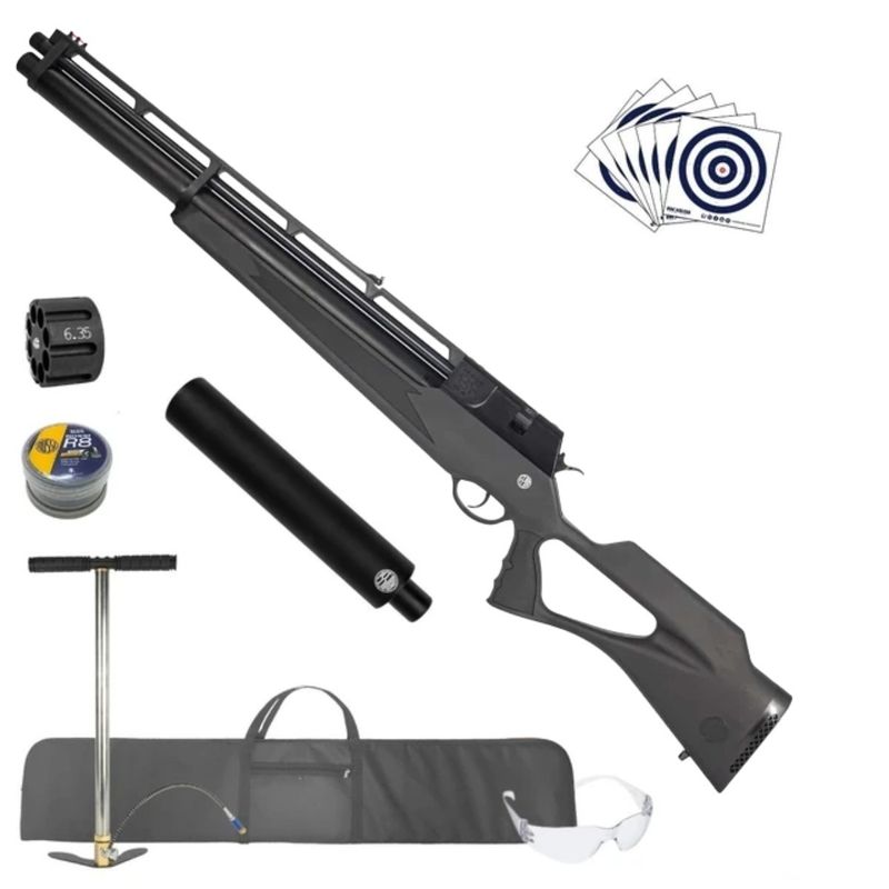 A Carabina Rossi Black Polímero PCP R8 Chumbinho 5,5mm .22 + Bomba dispara no modo Semi Automática com velocidade de 100fps - 30m/s e energia de 60 Joules Ver mais