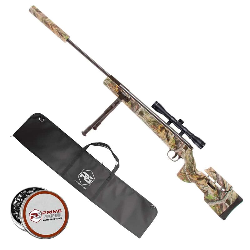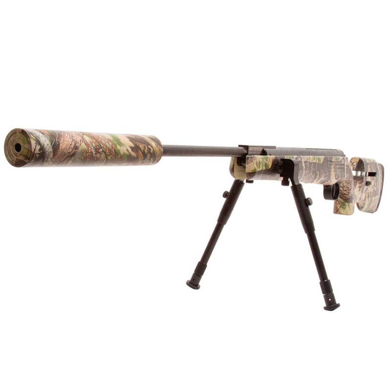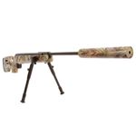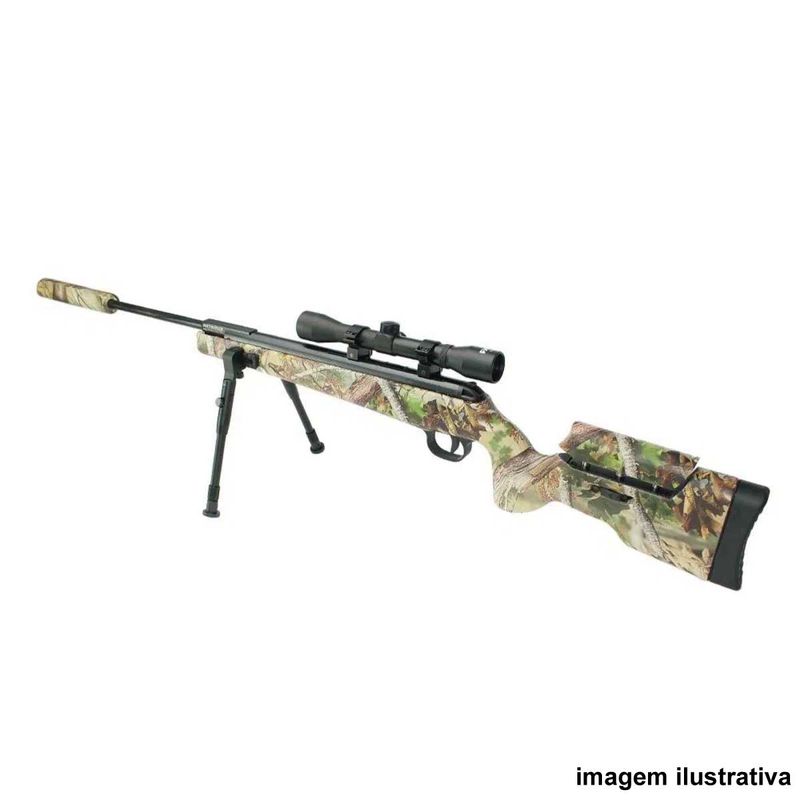 Seu acabamento camuflado e coronha em polímero ABS de alta densidade conferem resistência e visual moderno. Acompanha bipé, trilhos Picatinny laterais, trilho superior de 11mm, e supressor de ruído integrado que também facilita o basculamento do cano.