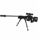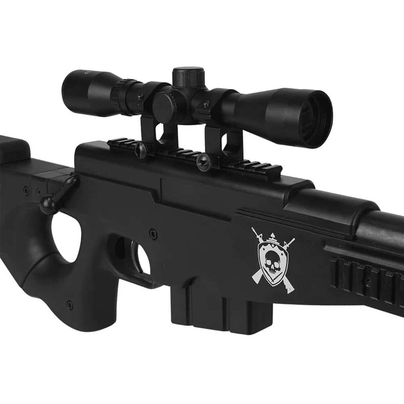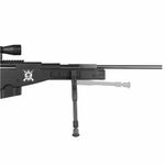 Seu visual tático é reforçado por acessórios inclusos como bipé ajustável e luneta 4x32, além de coronha tipo thumbhole com ajuste de altura, garantindo conforto e ergonomia mesmo em sessões prolongadas de uso.