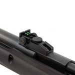 Conta com miras abertas com fibra óptica — a massa é protegida por túnel, e a alça tem ajuste milimétrico vertical e horizontal. Caso queira, é possível instalar red dot ou luneta no trilho de 11mm.