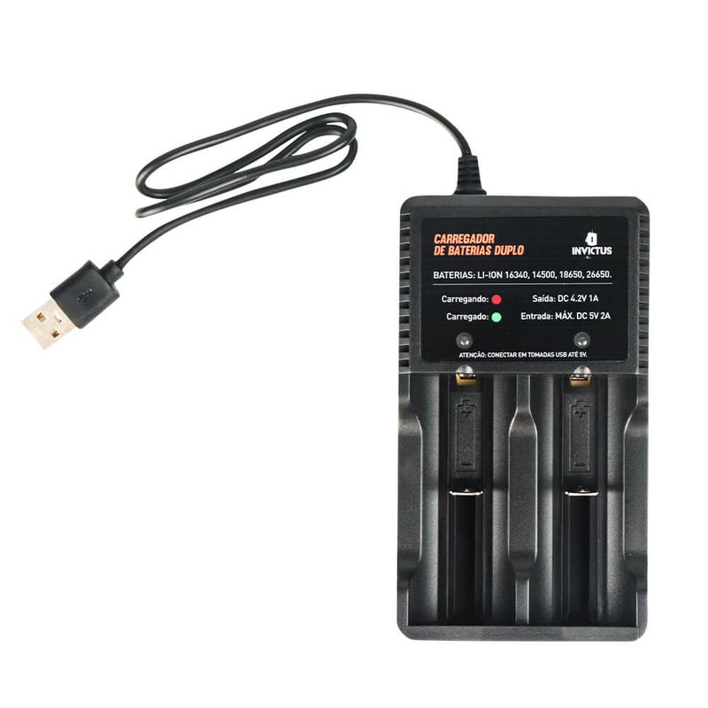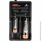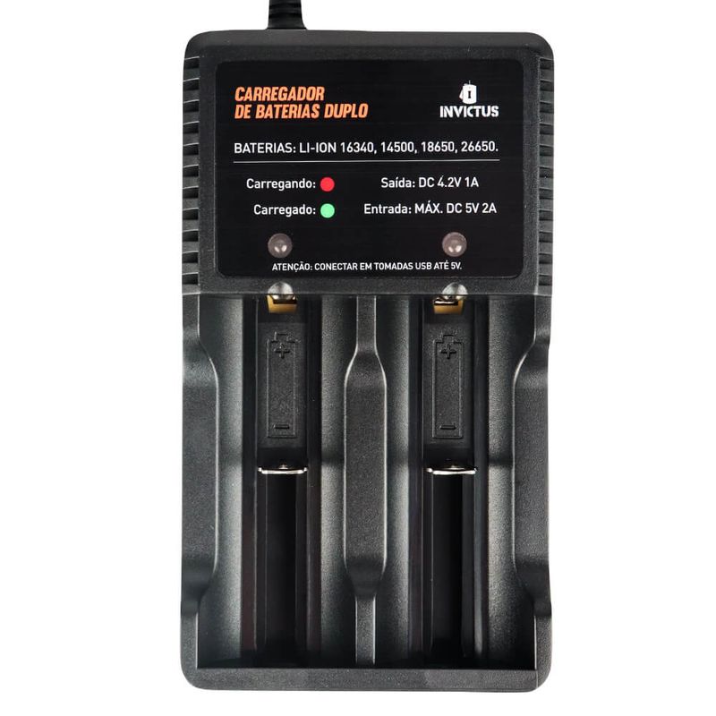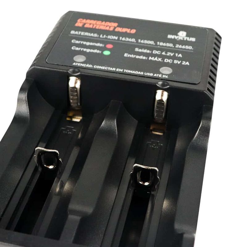 Características: Carrega 2 baterias simultaneamente – modelos 14500, 16340, 18650, 26650 – com carregamento independente e LEDs indicadores