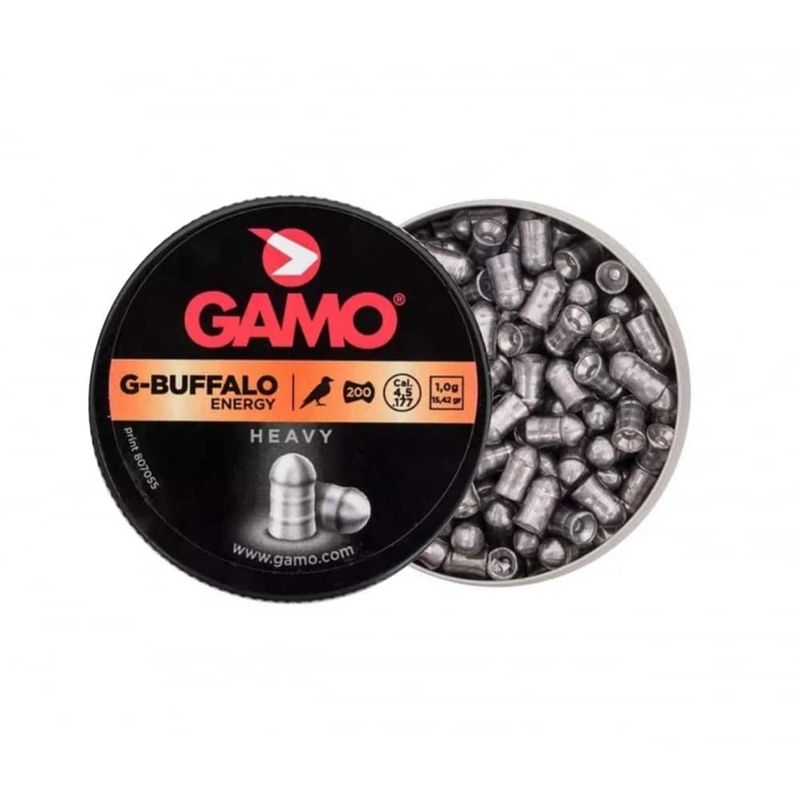 O Chumbinho Gamo G-Buffalo Energy é o modelo ideal para o atirador que busca velocidade, longo alcance, excelente precisão e penetração. Com formato Domed ou Cabeça arredondada, o chumbo G-Buffalo Energy, é conhecido como o "coringa dos chumbinhos", pois além de eficiente ele pode ser utilizado para diversas finalidades. O Gamo G-buffalo pesando 1,0g/15,42gr é a munição ideal para carabinas de potência e precisão.