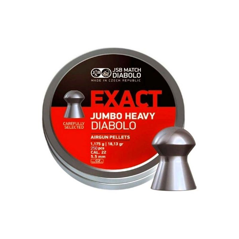 Os pellets JSB possuem gramatura 18.13 são fabricados em Bohumin, República Tcheca por Joseph Schulz, e são considerados por muitos como os pellets mais precisos disponíveis em todo o mundo. O Exact Diabolo possui um peso intermediário, sendo um chumbinho de ponta arredondada(Domed) que fornecerá melhor estabilização de voo e precisão fina. Trata-se de um munição para Carabinas Airgun muito poderosas.